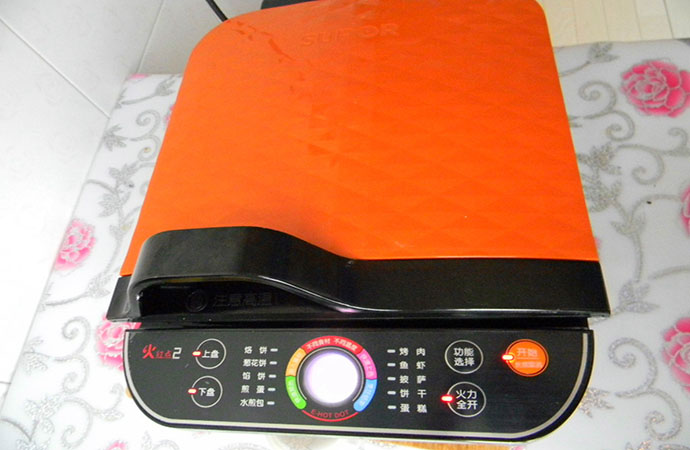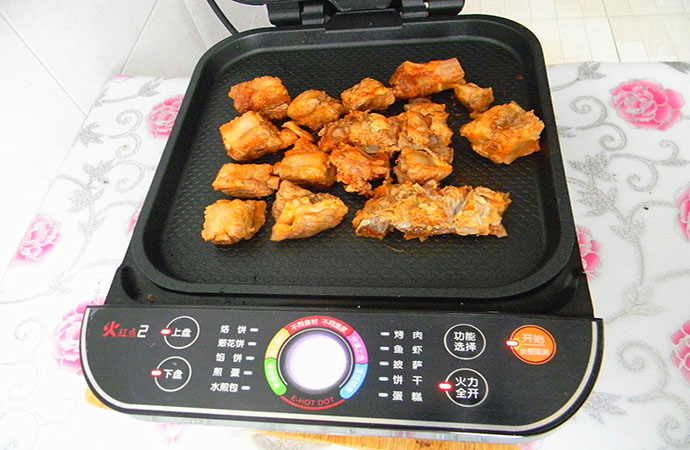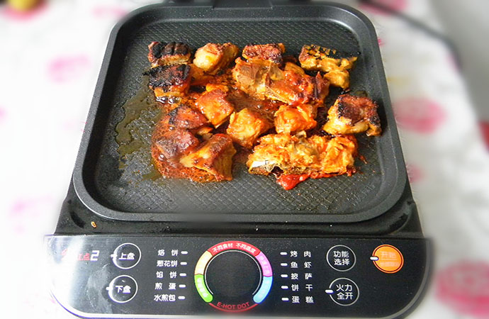 8.中間翻動幾次,煎烤機通電燒熱,選擇烤肉健,烤盤上擺好腌好的排骨。蓋蓋子不用管玩去吧;