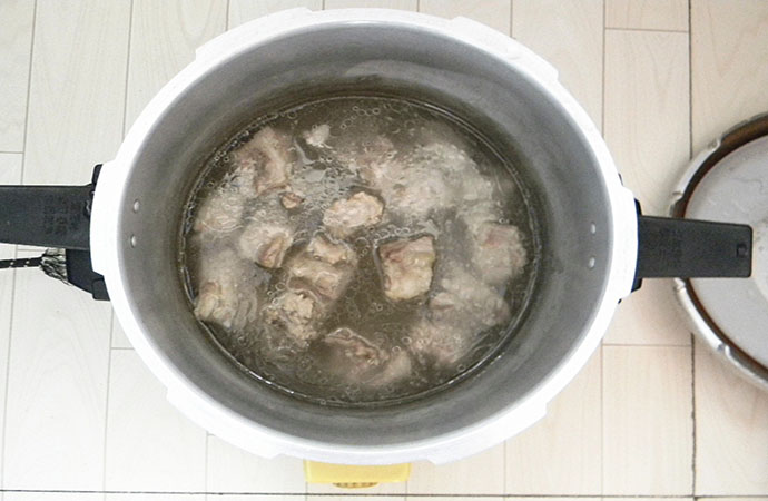 2.壓力鍋燒開水,放入排骨,在蓋好,煮壓五分鐘;