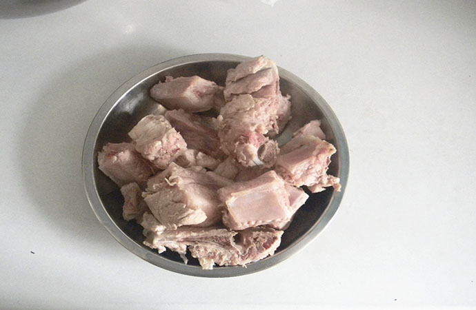 4.記得要燒開水后在放入排骨哦,咱吃的是肉,要是喝湯才要涼水放排骨;