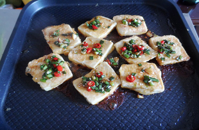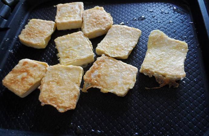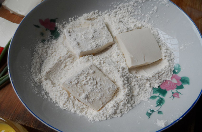 1.豆腐用清水浸泡10分鐘,瀝干水分,切成塊狀