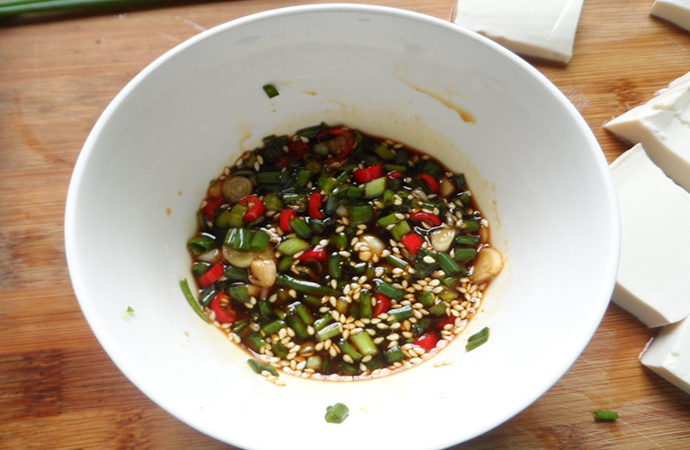 2.蔥,辣椒切碎。醬油倒入碗里,加入蔥,辣椒,姜粉,芝麻。