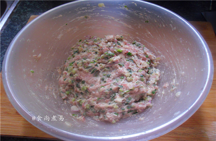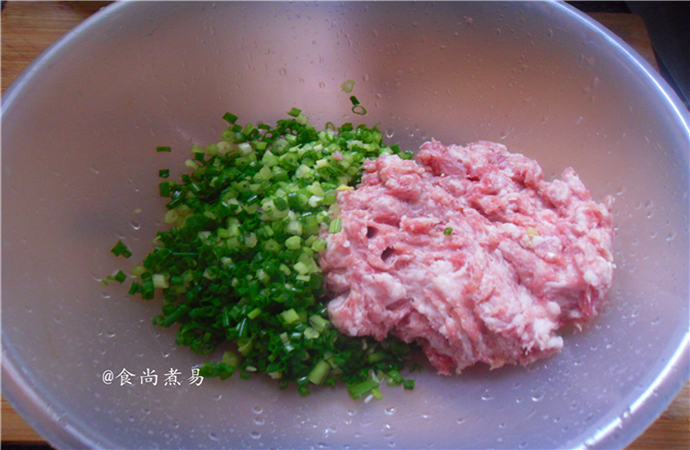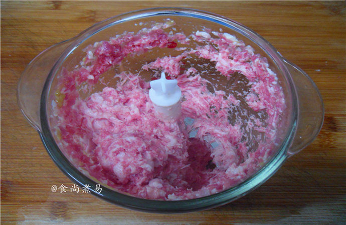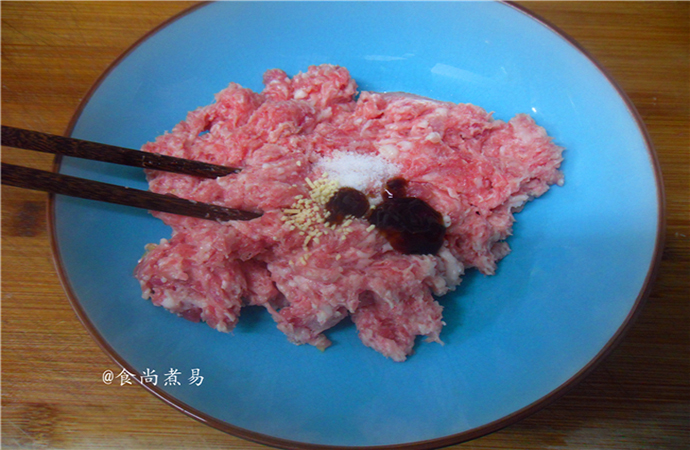 3.準(zhǔn)備餡料:豬肉洗凈切小塊用攪拌機(jī)攪成肉末,用大碗盛起
