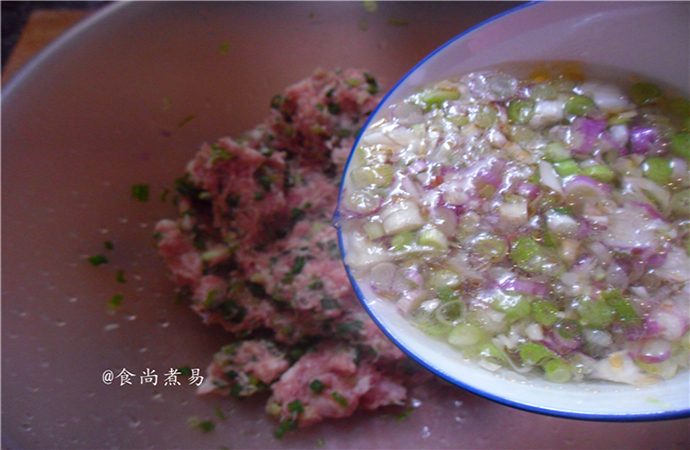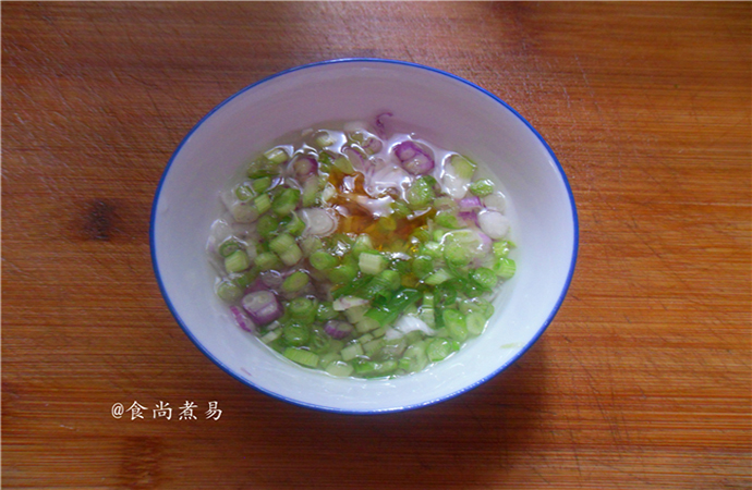 6.切碎蔥頭部分用碗盛起,倒入少許花椒油、再加上少許清水浸泡