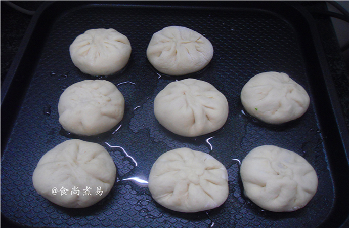 15.中間加少量清水,再煎燜3分鐘左右,至包子兩面焦黃色即可