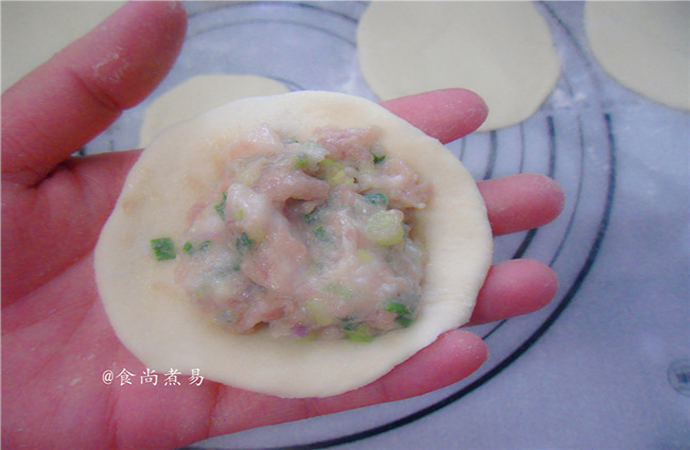 11.將小面團(tuán)搟薄,放入調(diào)好的餡料,四邊收攏包起