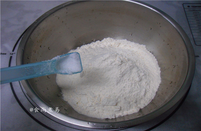 1.面粉用大盆盛起,調(diào)入酵母粉、少許鹽