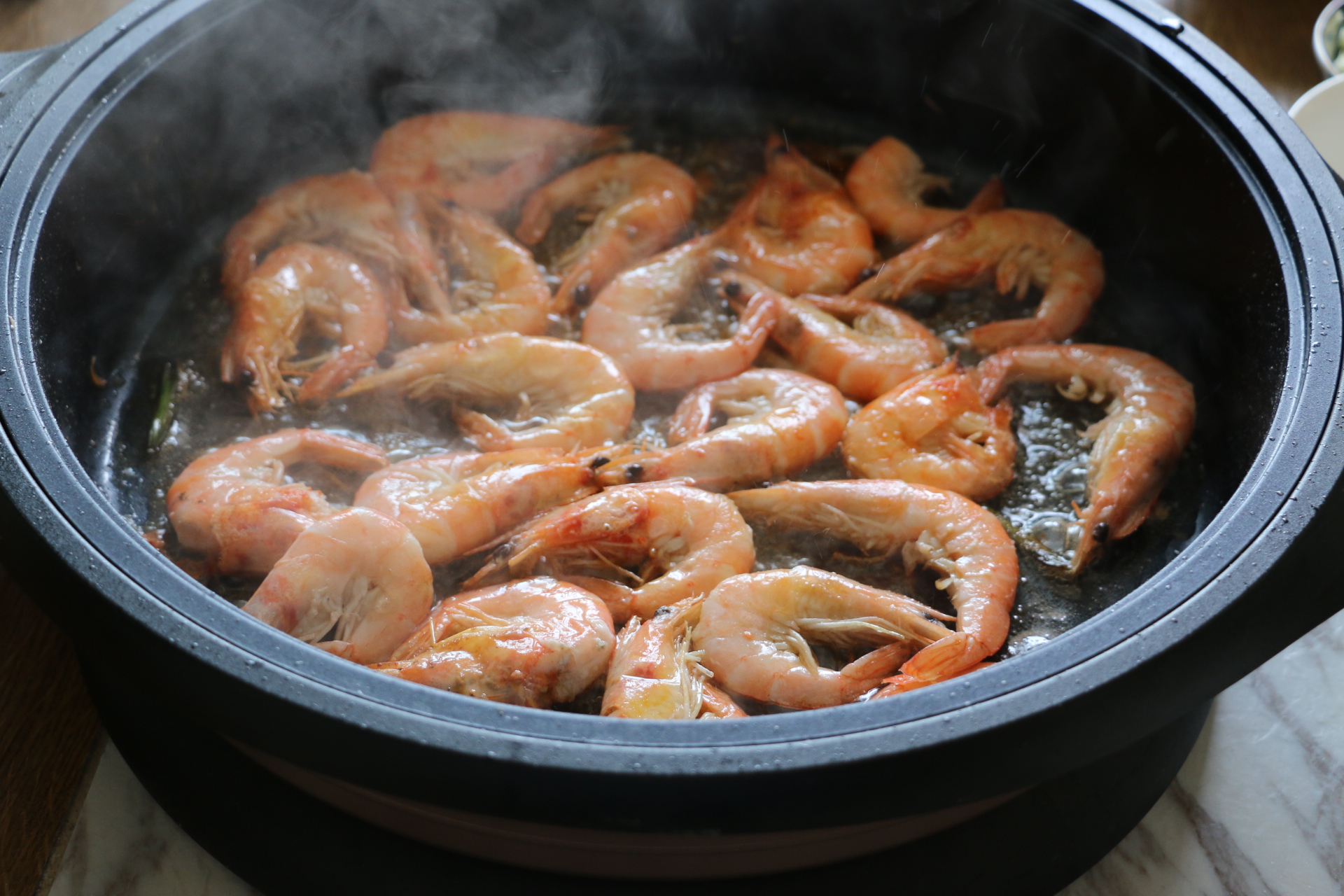 4.放入蝦小火煎,不時用木鏟按一下蝦頭,以便出點蝦油,煎好一面再翻面煎另一面