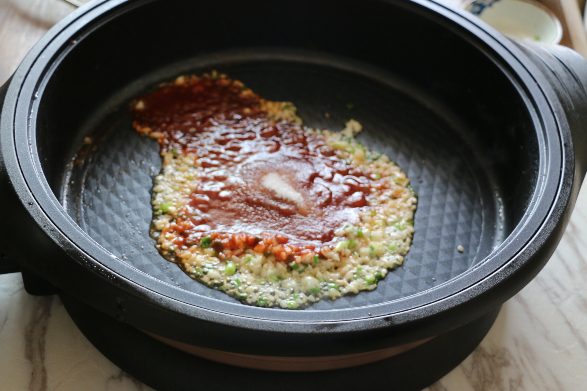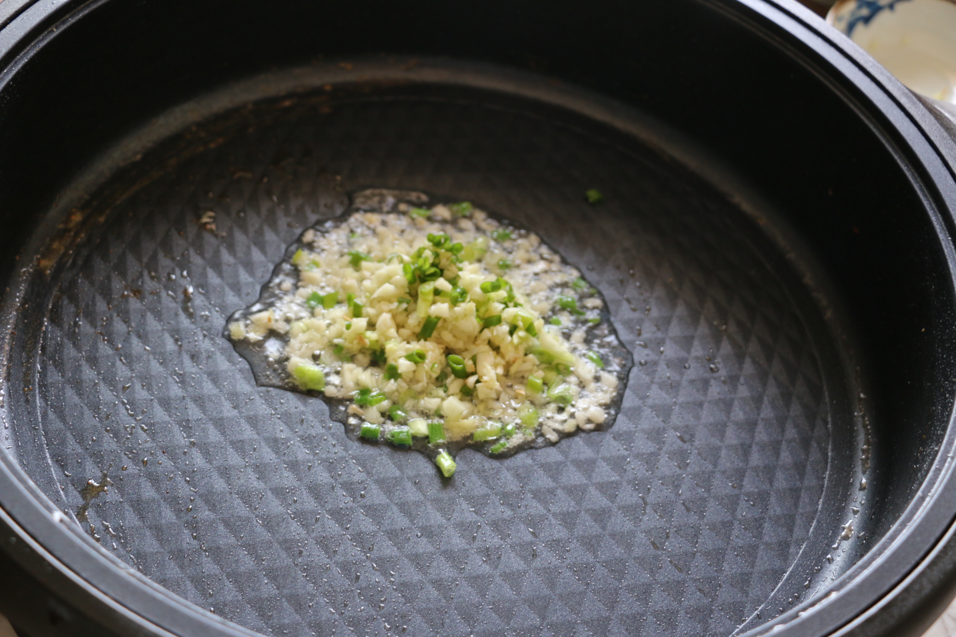 3.蘇泊爾煎烤機里多放點油,開大火預熱好,放入蔥段爆香