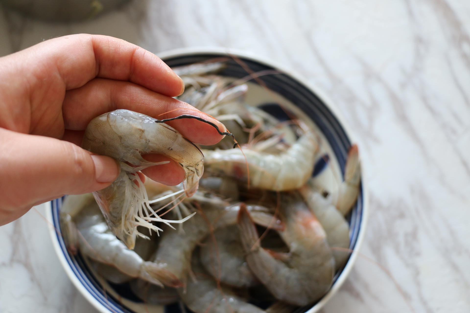 2.用剪刀剪開蝦背取出蝦線,把蝦洗一遍