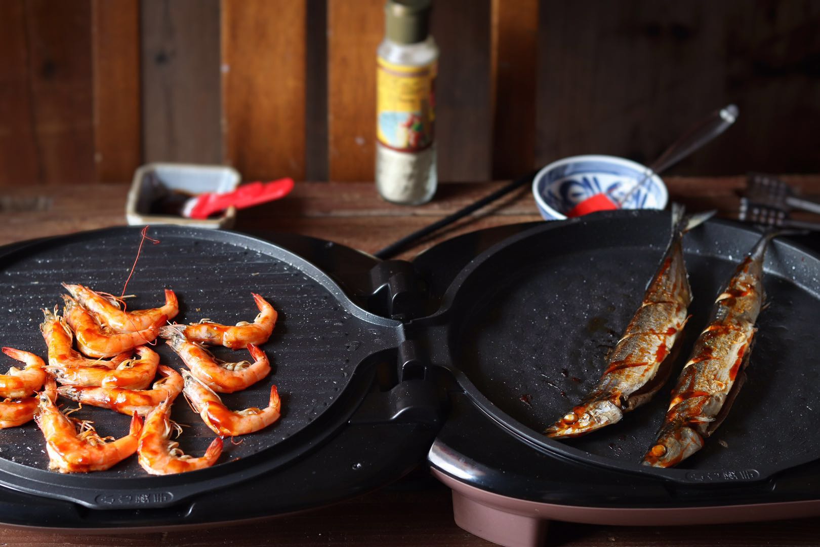 4、把蝦與魚分開煎烤,以免熟與不熟混在一起