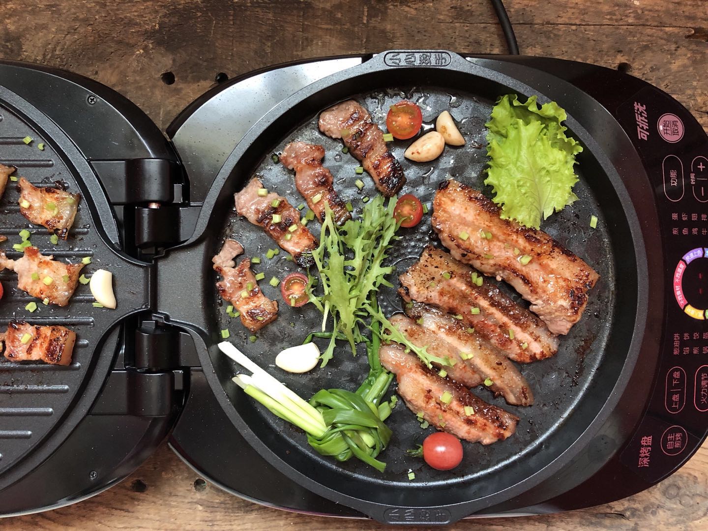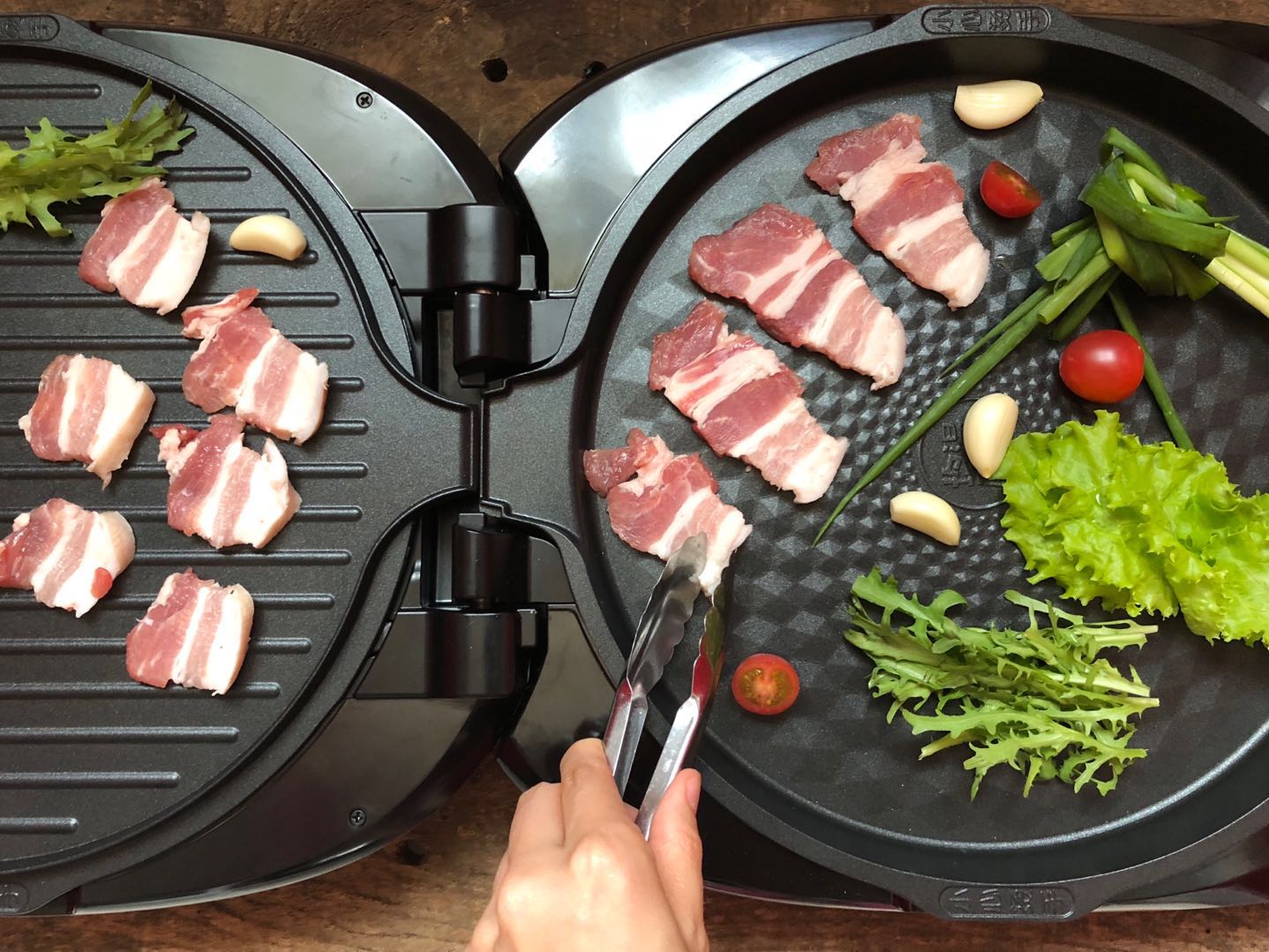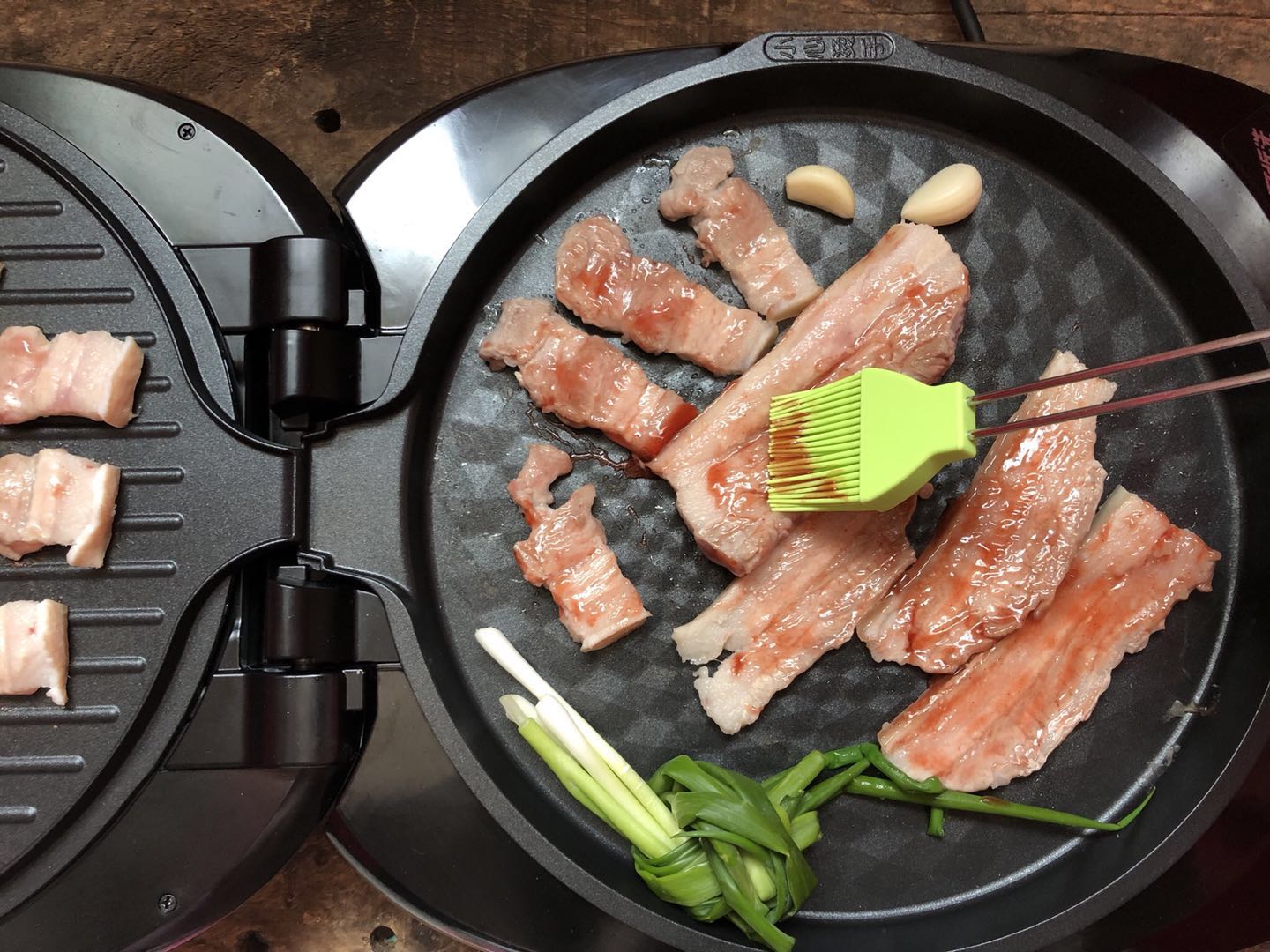 2、切好的豬五花肉放入煎烤盤內,放入蒜瓣兒、香蔥。