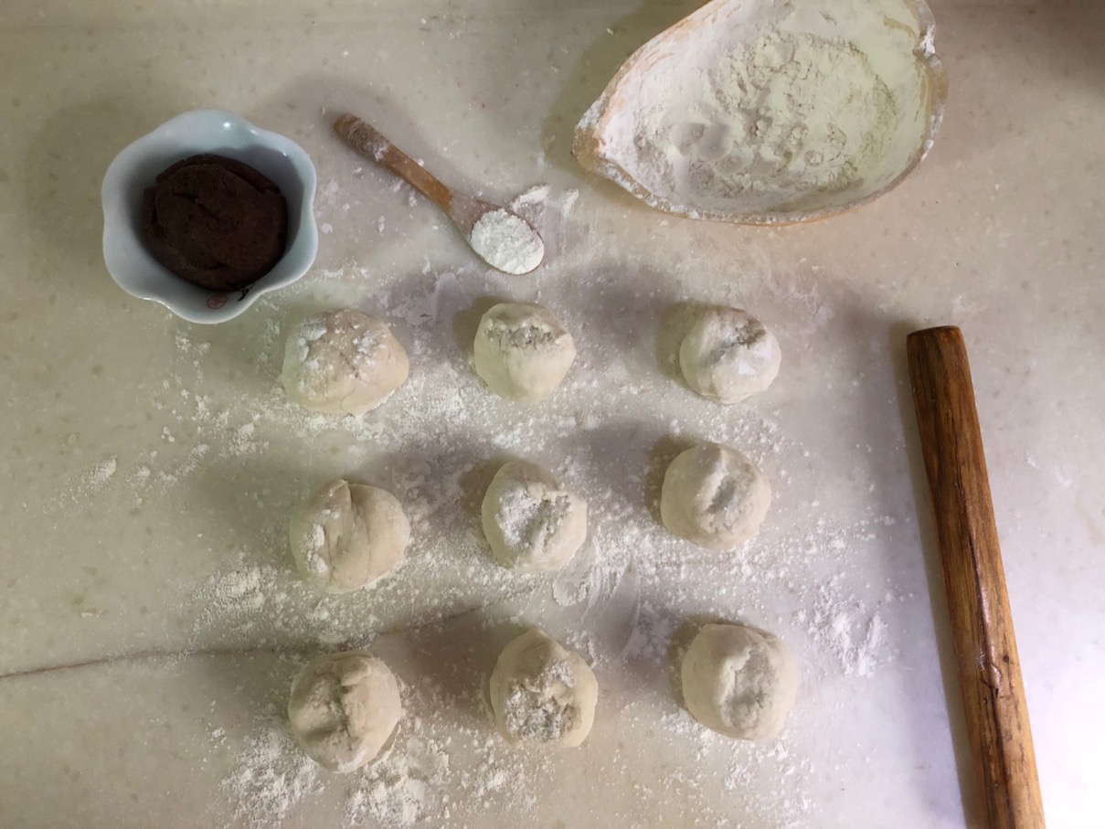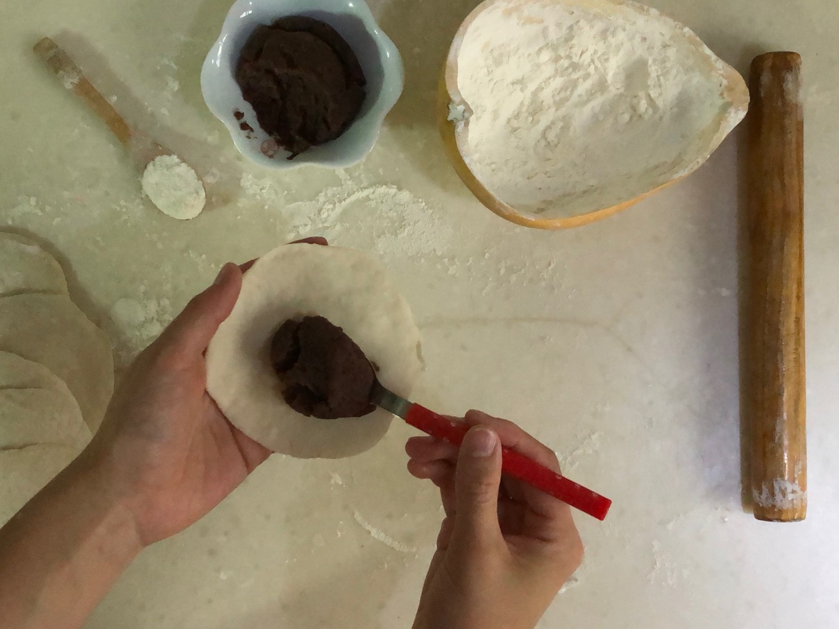 6、取一只面皮放入20g紅豆沙,包包子一樣捏緊封口,捏好的褶皺部分朝下碼放在一邊。