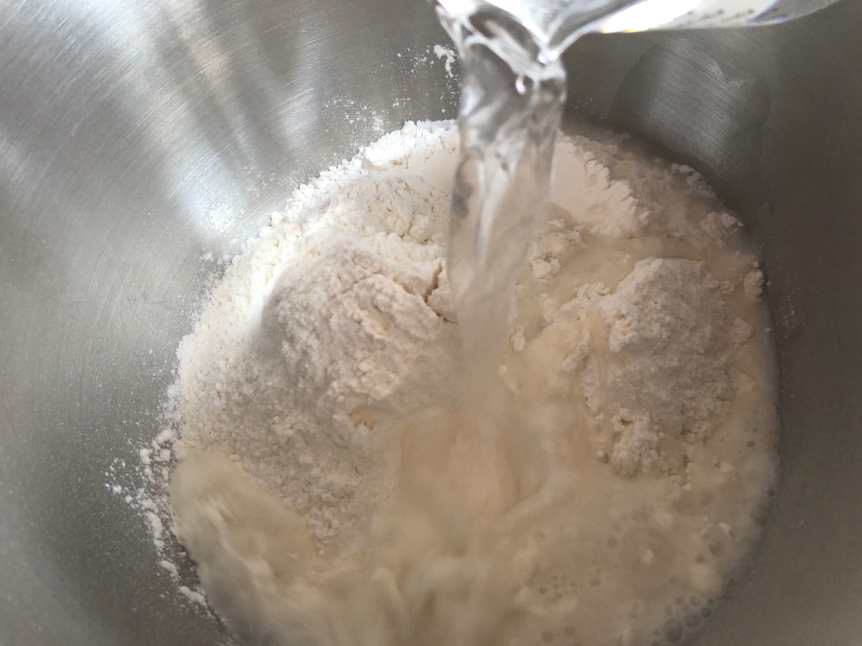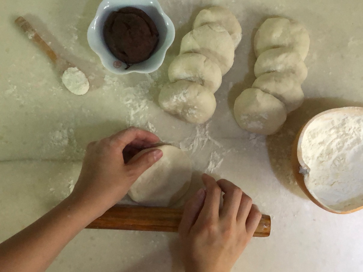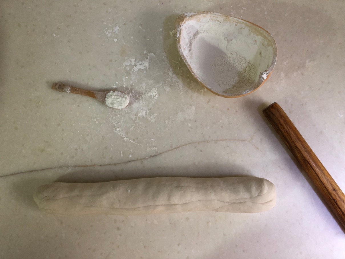 4、分割成微胖的劑子,撒少許手粉,以掌心壓扁劑子;