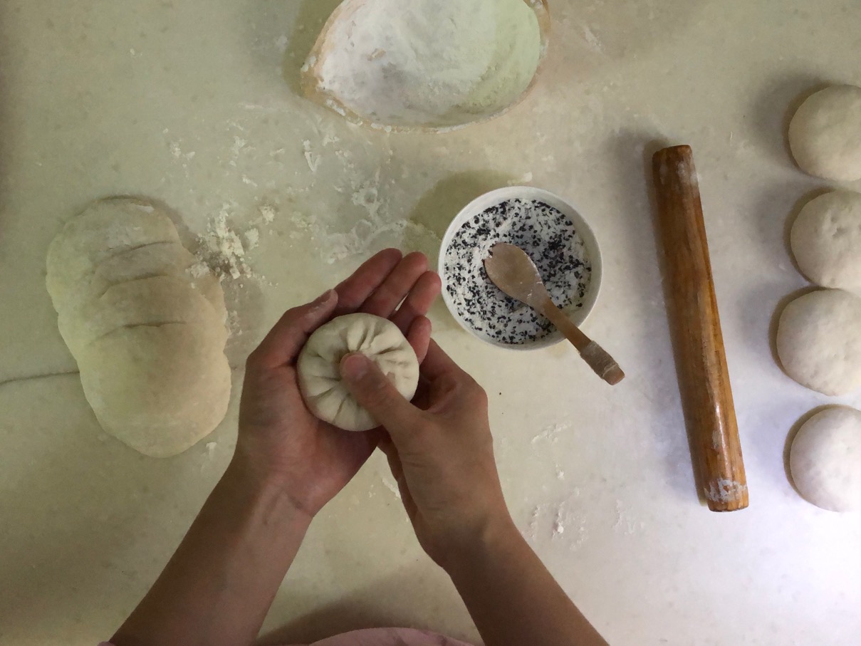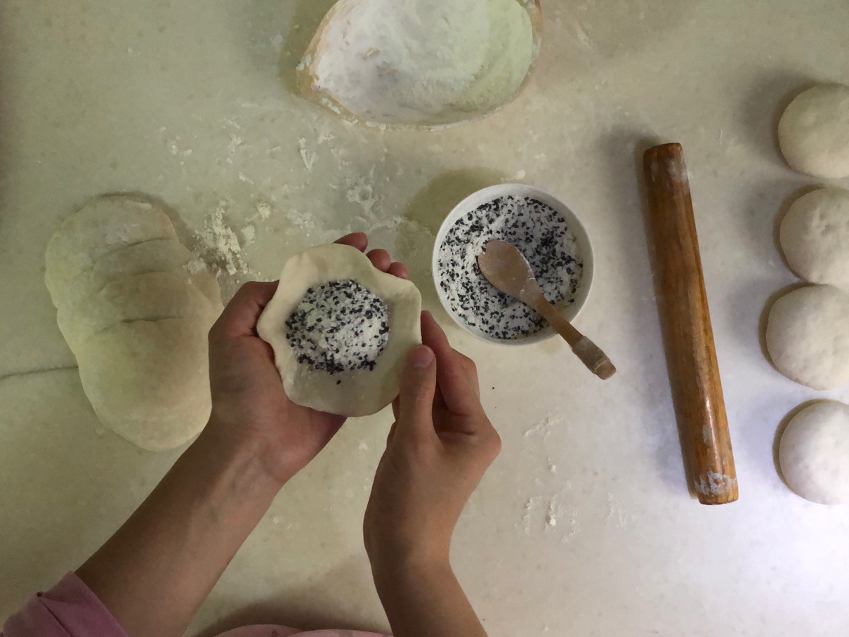 7、取一只面皮放入混合好的黑芝麻白糖內餡,捏緊封口,依然封口朝下碼放在一邊。