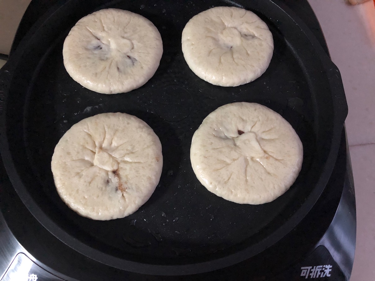10、蘇泊爾煎烤機插上電源,選擇煎餃模式,鍋內倒入少許油涂抹均勻,放入糖餅胚;蓋上蓋子進行烙制;