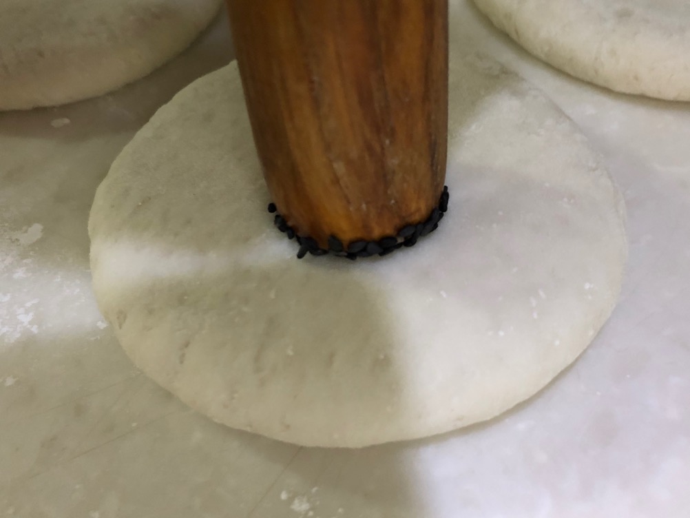 9、餅胚表面粘少許水,搟面杖沾水粘上芝麻按壓在餅胚表面。