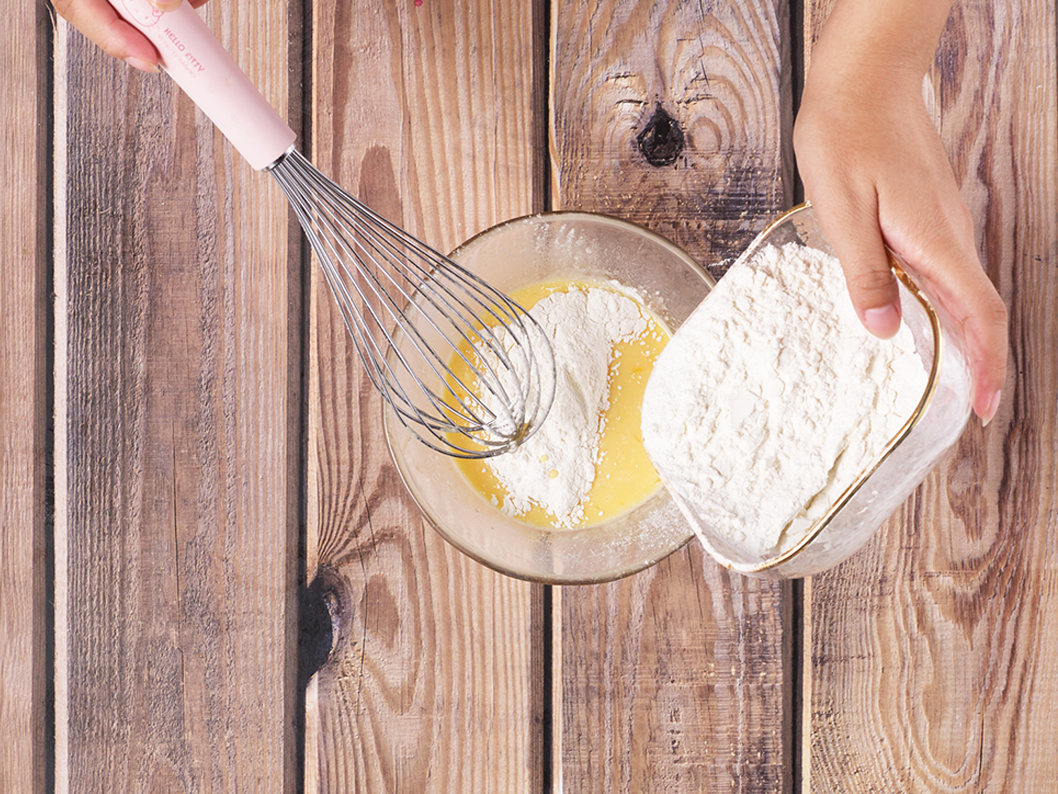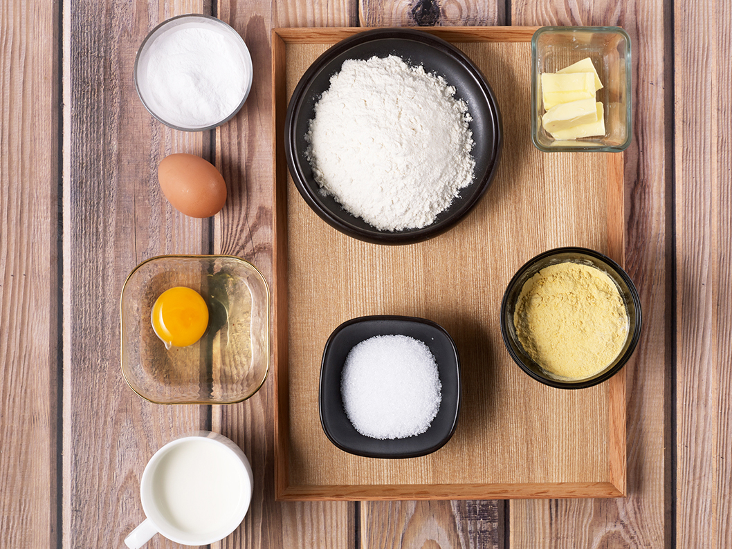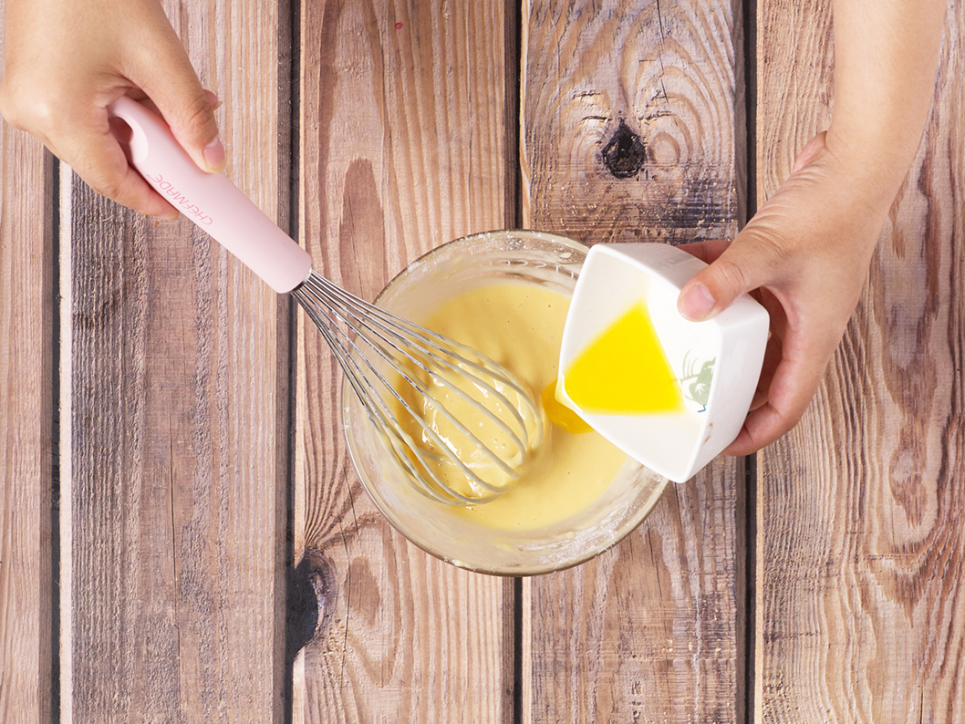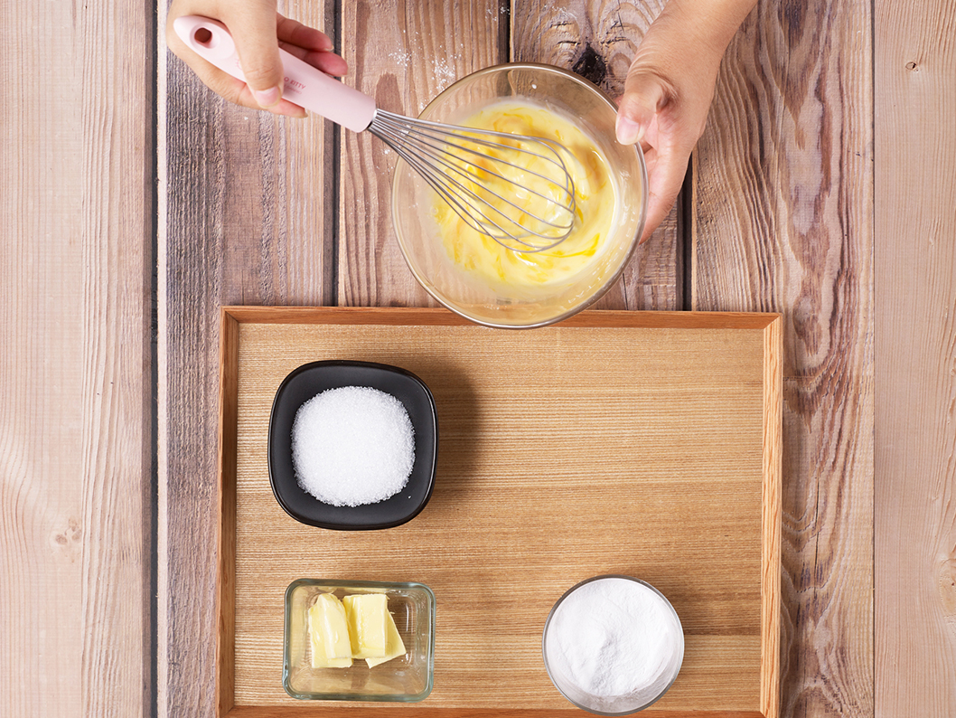 配料:雞蛋2個、木糖醇35g、液態黃油10g、純牛奶120mL