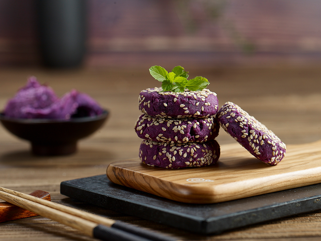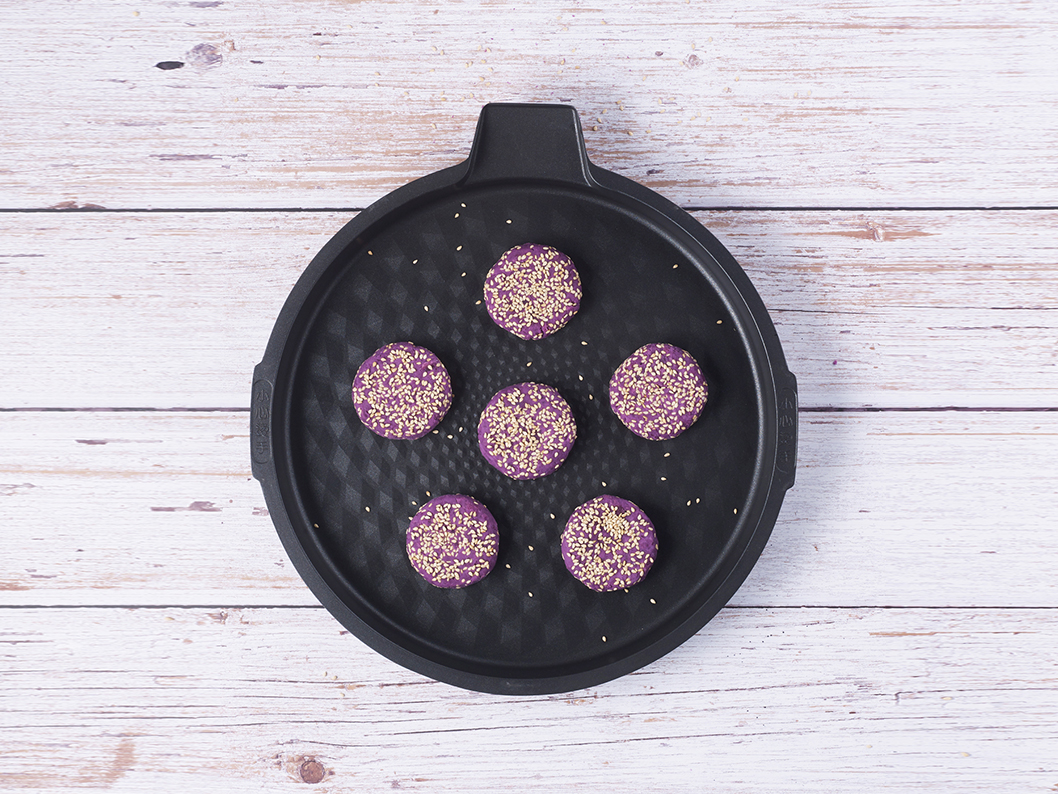 3、紫薯泥捏成小球30g,在芝麻中滾一滾后壓扁;