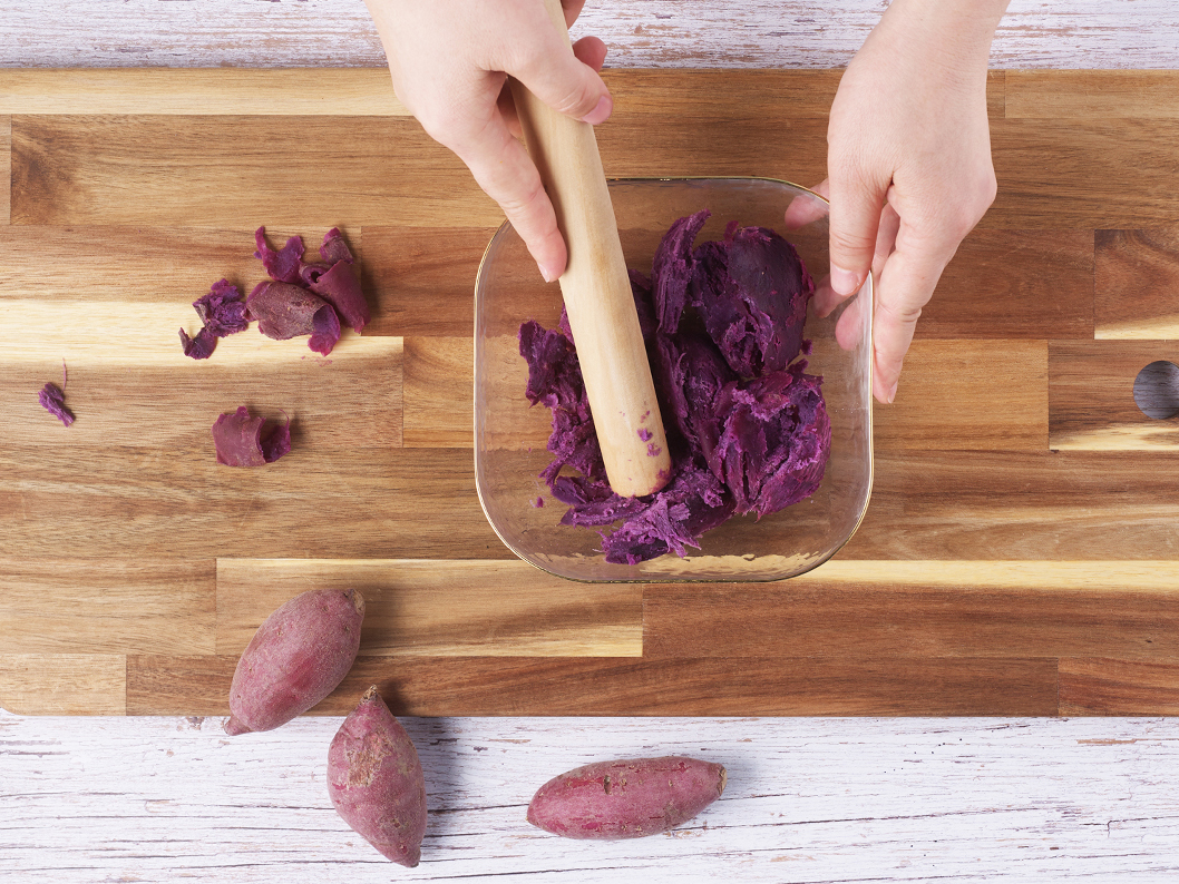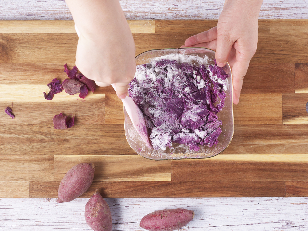 1、紫薯洗干凈蒸熟,去皮后用勺子壓碎;