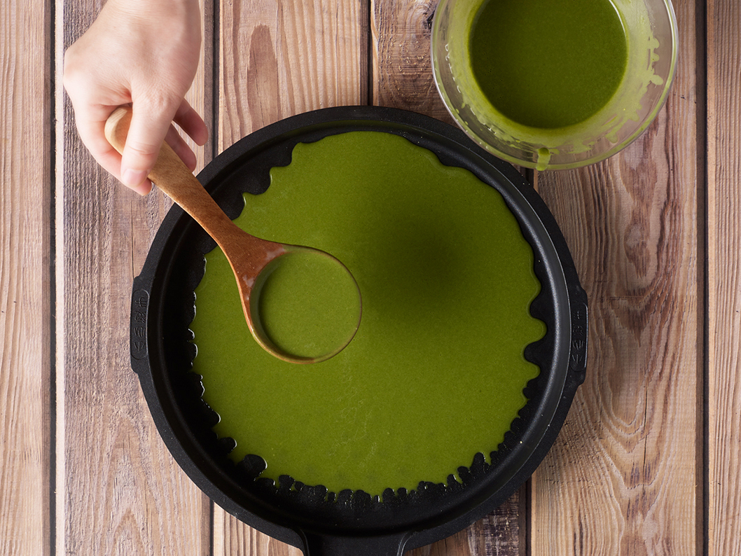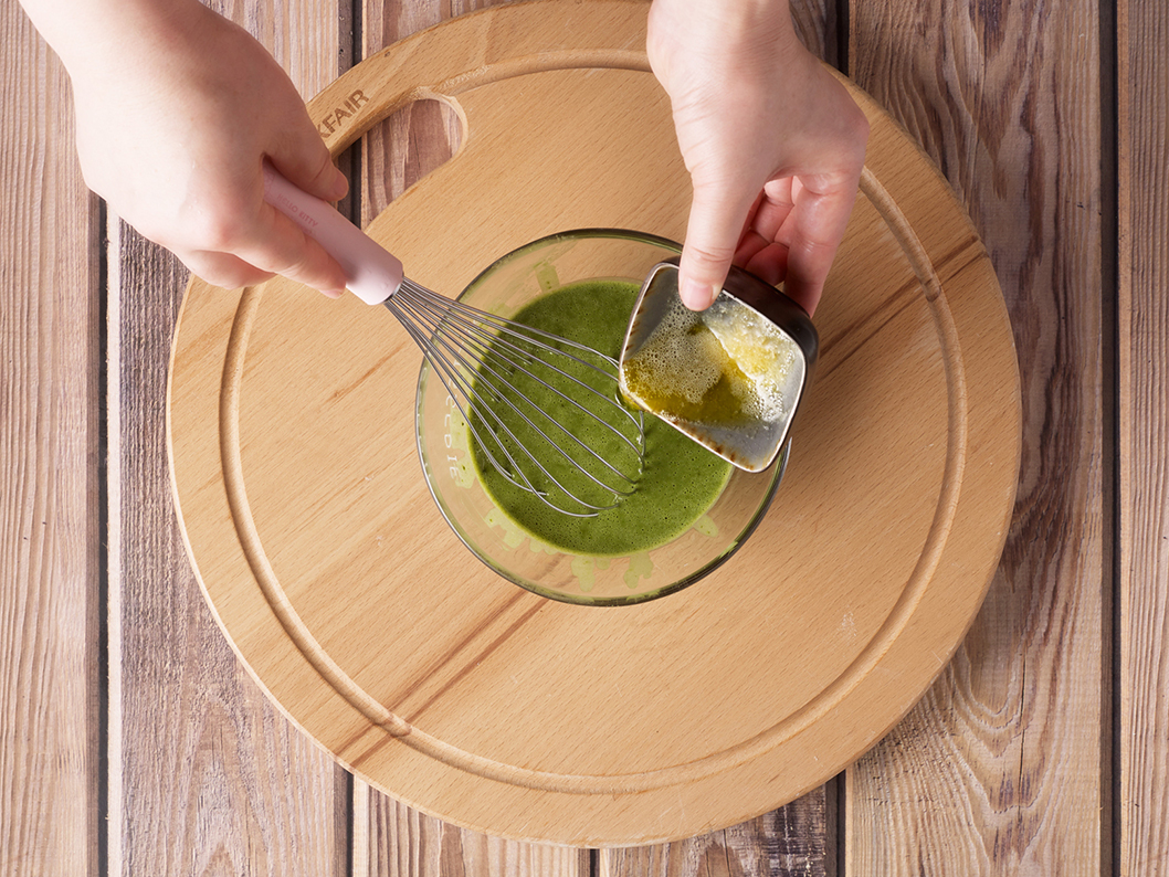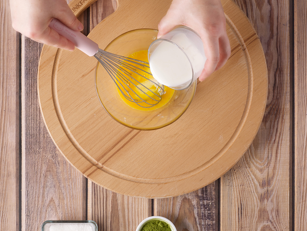 1、雞蛋加30克白糖打發至砂糖融化,加入牛奶攪拌均勻,抹茶粉和攪拌粉混合后,過篩至蛋奶液中,攪拌均勻后加入熔化的黃油,攪拌至無顆粒;
