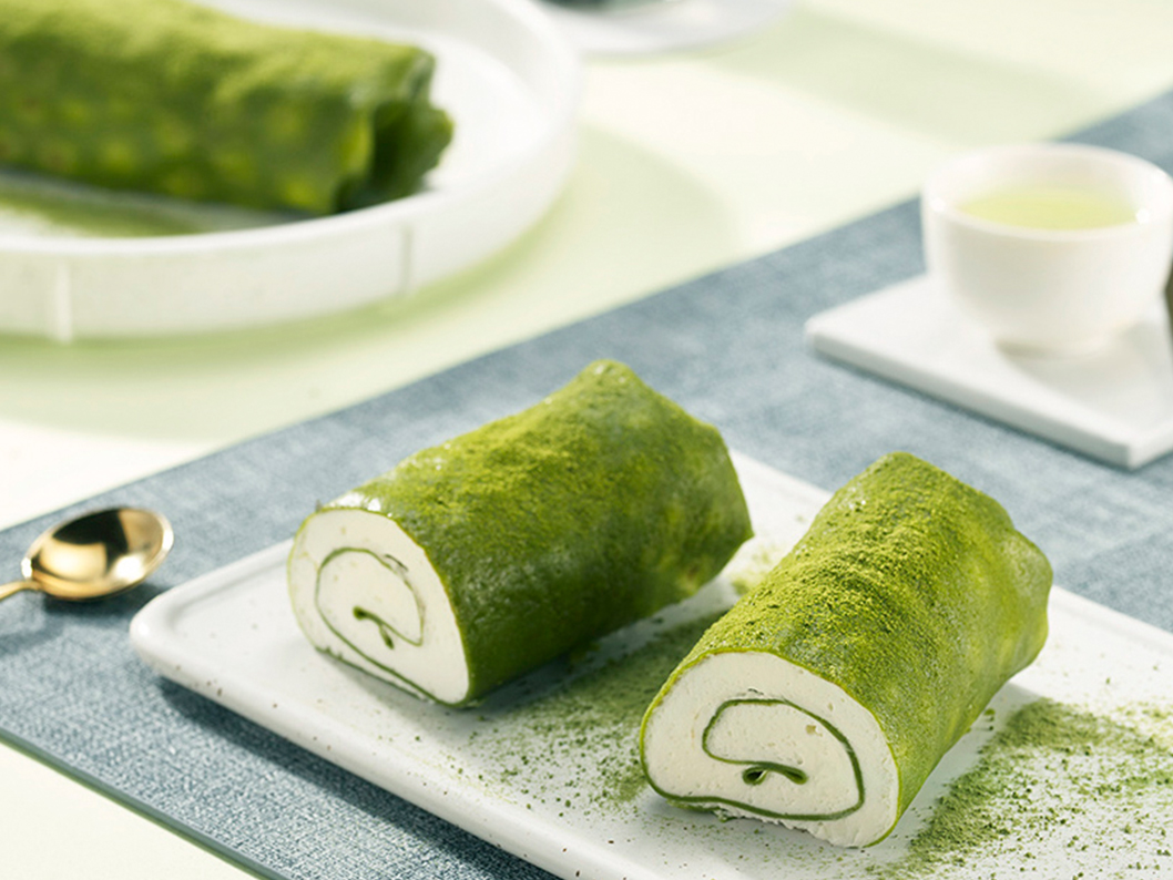 6、取出冷藏的毛巾卷,撒抹茶粉,毛巾卷即可食用了。