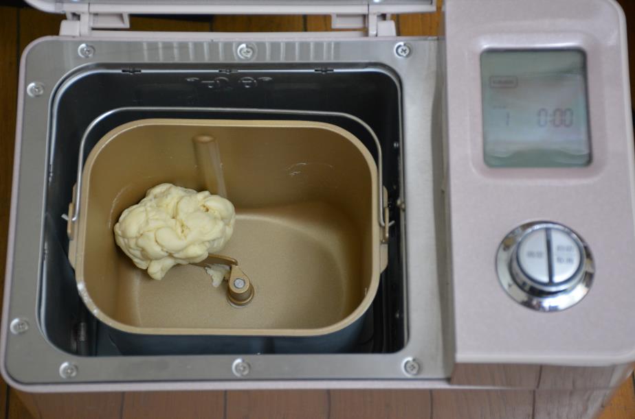 1、面粉和酵母、玉米油、細砂糖和牛奶放入面包機桶,揉至面團無顆粒光滑。