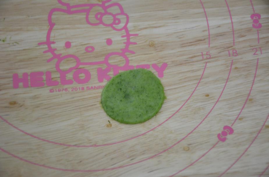 5、取一份抹茶面團,排氣揉圓壓平后,壓出圓片。