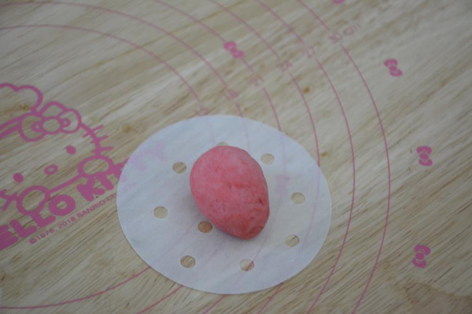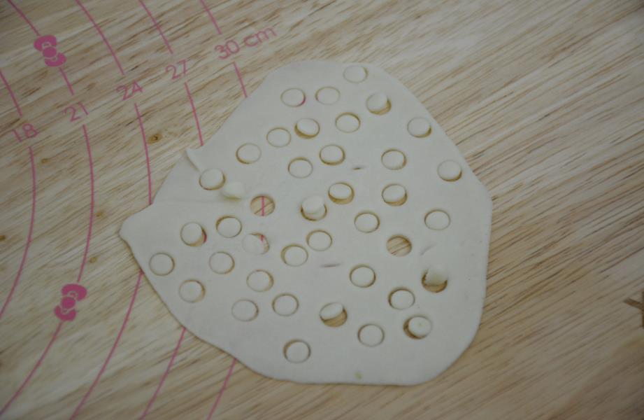 9、白色面團排氣壓平,用一個圓形裱花嘴,壓出小圓圈。