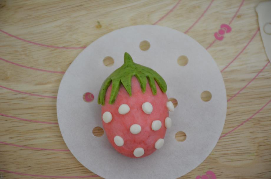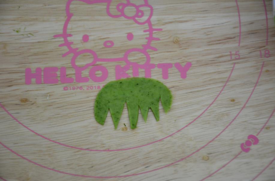 7、抹茶面片沾上少許水,然后貼在紅色面團上,覆蓋紅色面團三分之一處。