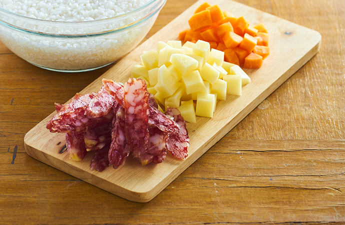 4、蜂鳴器響起后放入香腸、姜絲、土豆丁和胡蘿卜丁,同時(shí)沿著鍋壁澆2勺油后繼續(xù)烹飪;