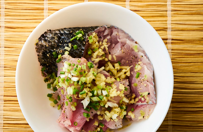 2、魚身片刀,并用姜片,蔥末,料酒,鹽,胡椒粉腌制半小時;