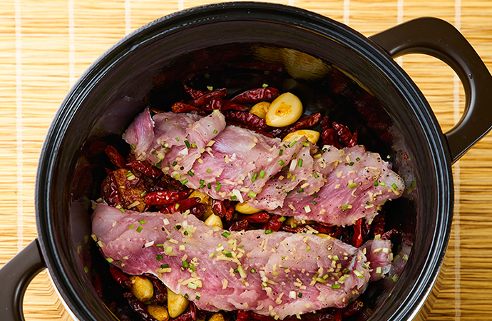 】:香料(干辣椒10克、花椒10克、青花椒30克、豆母子50克、胡椒粉3克、)、豆瓣醬10克、老姜40克、蒜瓣50克、雞精8克、黃酒50克、生抽10克、精鹽與蔥花適量。
