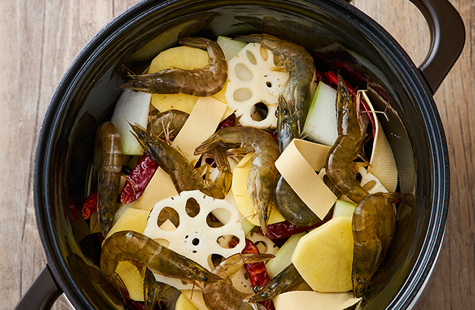 】:鮮蝦500克、蔬菜(冬筍100克、藕片100克、土豆片100克、豆皮100克、木耳20克、冬瓜100克)。