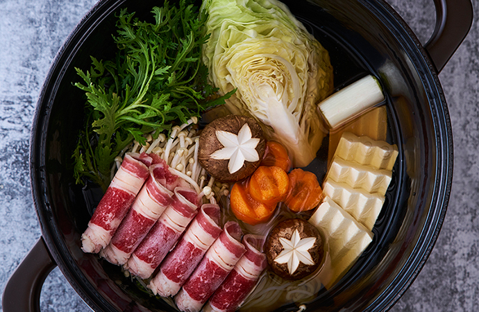 】:肥牛片1盒、卷心菜半顆、洋蔥1個、金針菇300克、胡蘿卜1根、香菇3個、老豆腐1塊、昆布100克、魔芋絲100克、烏冬面100克、茼蒿100克、土雞蛋2只。