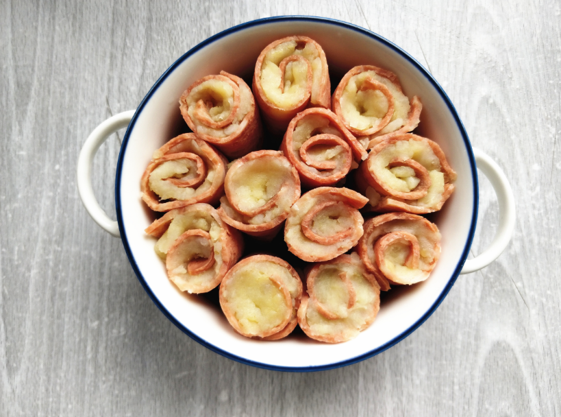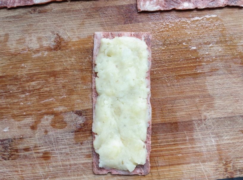 4. 將長條的培根從中間切開,均勻地鋪一層土豆泥后卷成卷。