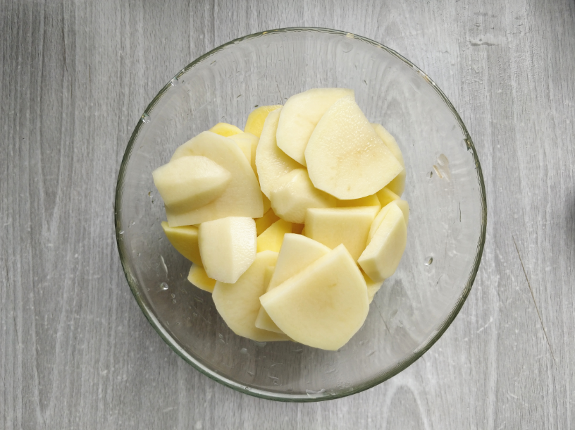 2. 將土豆洗凈去皮,切厚片后裝入碗中,蓋保鮮膜后入微波爐,高火加熱5分鐘左右。