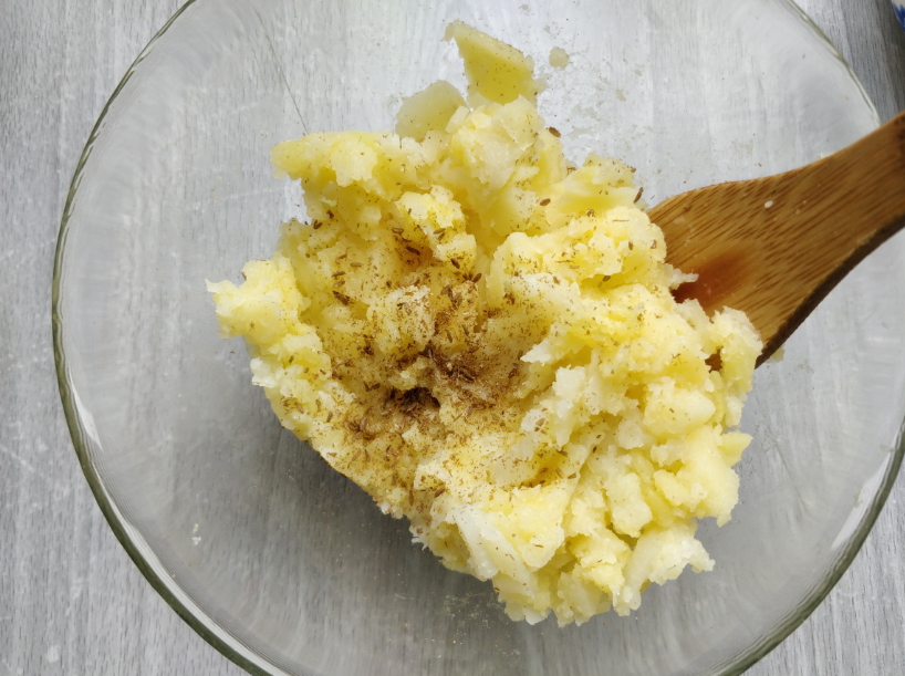 3. 取出后加鹽和孜然粉,碾成土豆泥拌勻。喜歡稍有顆粒感的話,用勺子碾碎就可以,如果喜歡更細膩口感的,可以將土豆泥裝入保鮮袋中,用搟面杖碾一下。
