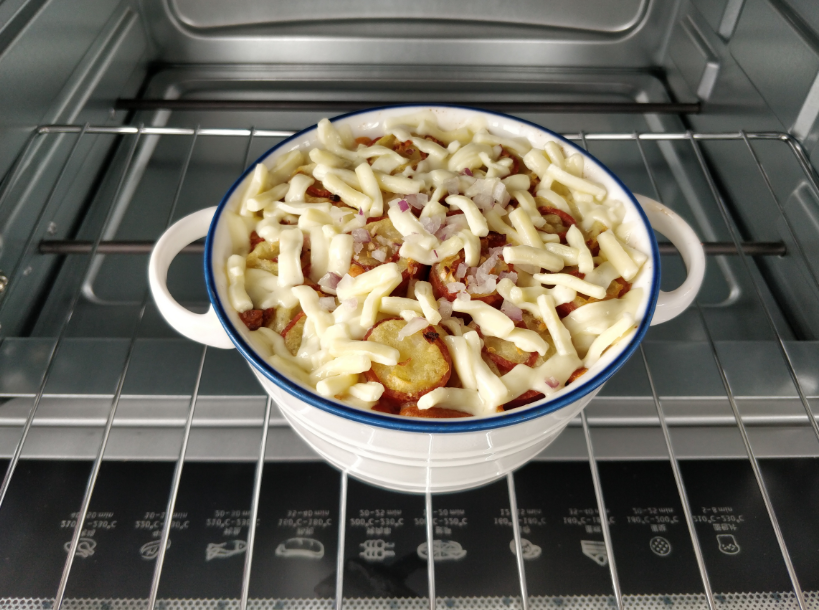 8. 完成后,融化的芝士會流到焗碗底部,這時再把剩余的部分芝士灑在上面。