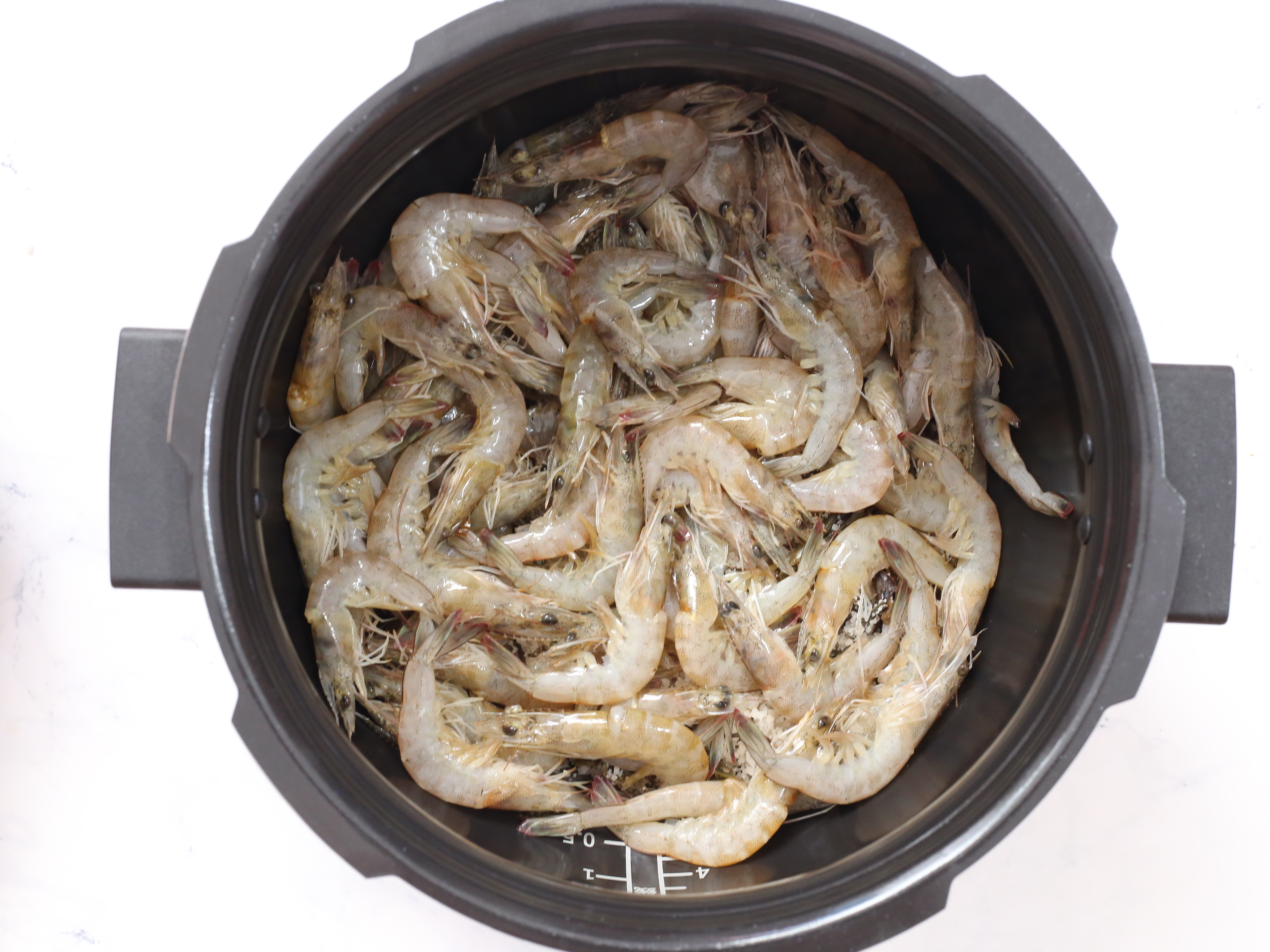 6.先倒入一般的茶葉鹽到不粘內鍋中,鋪上鮮蝦。