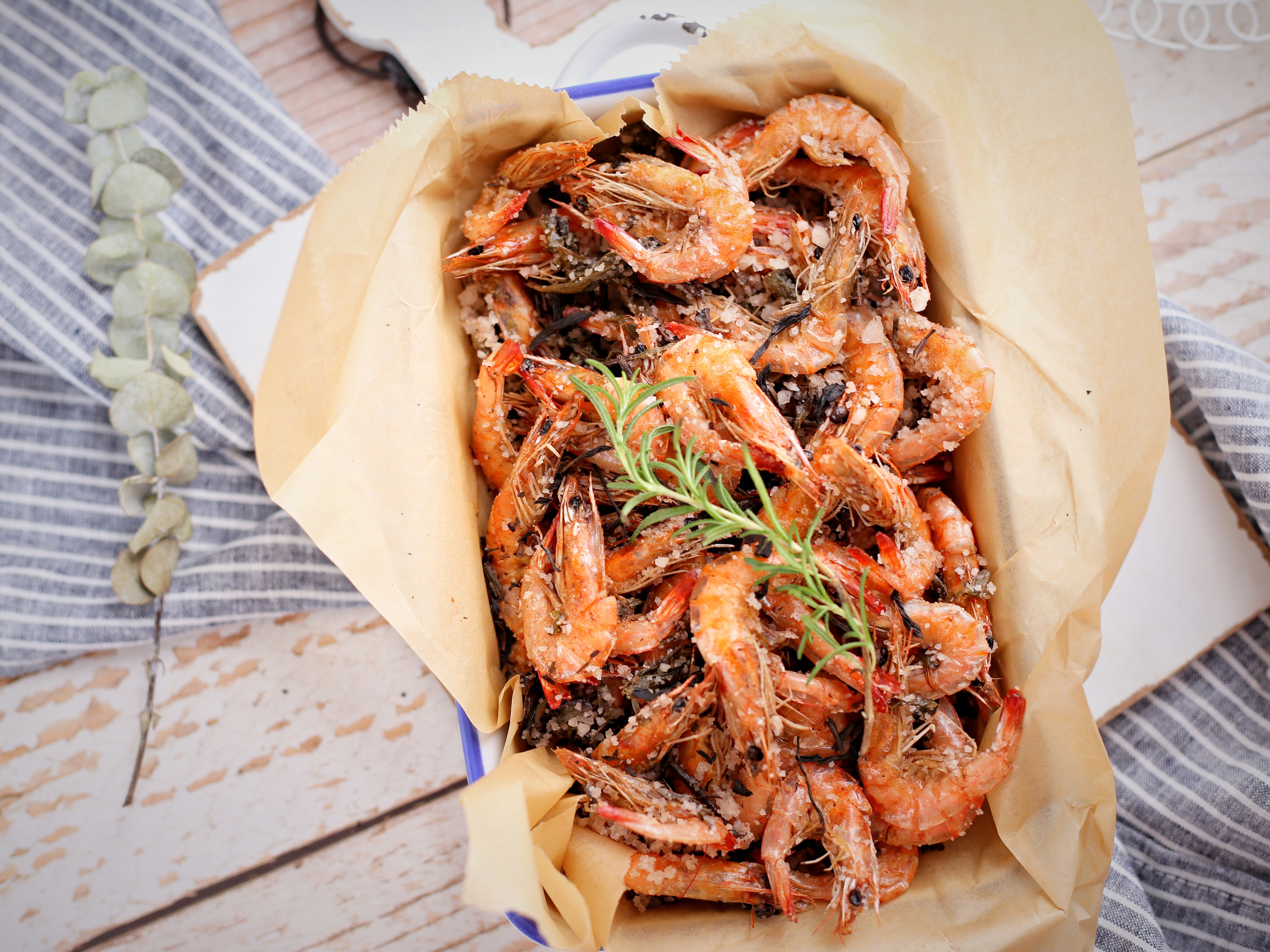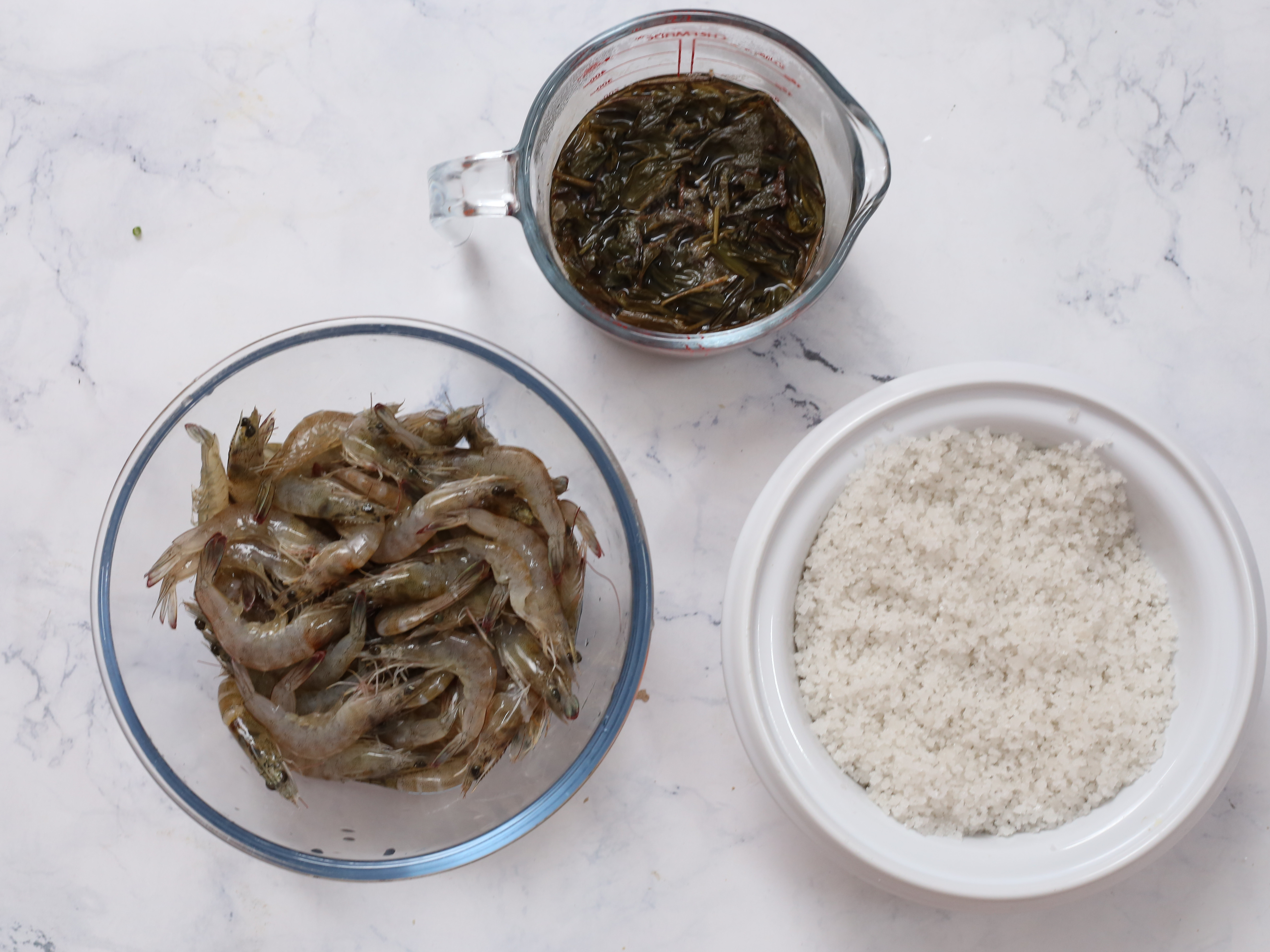 鮮蝦800g、粗鹽1000g、茶葉100g、開水300ml