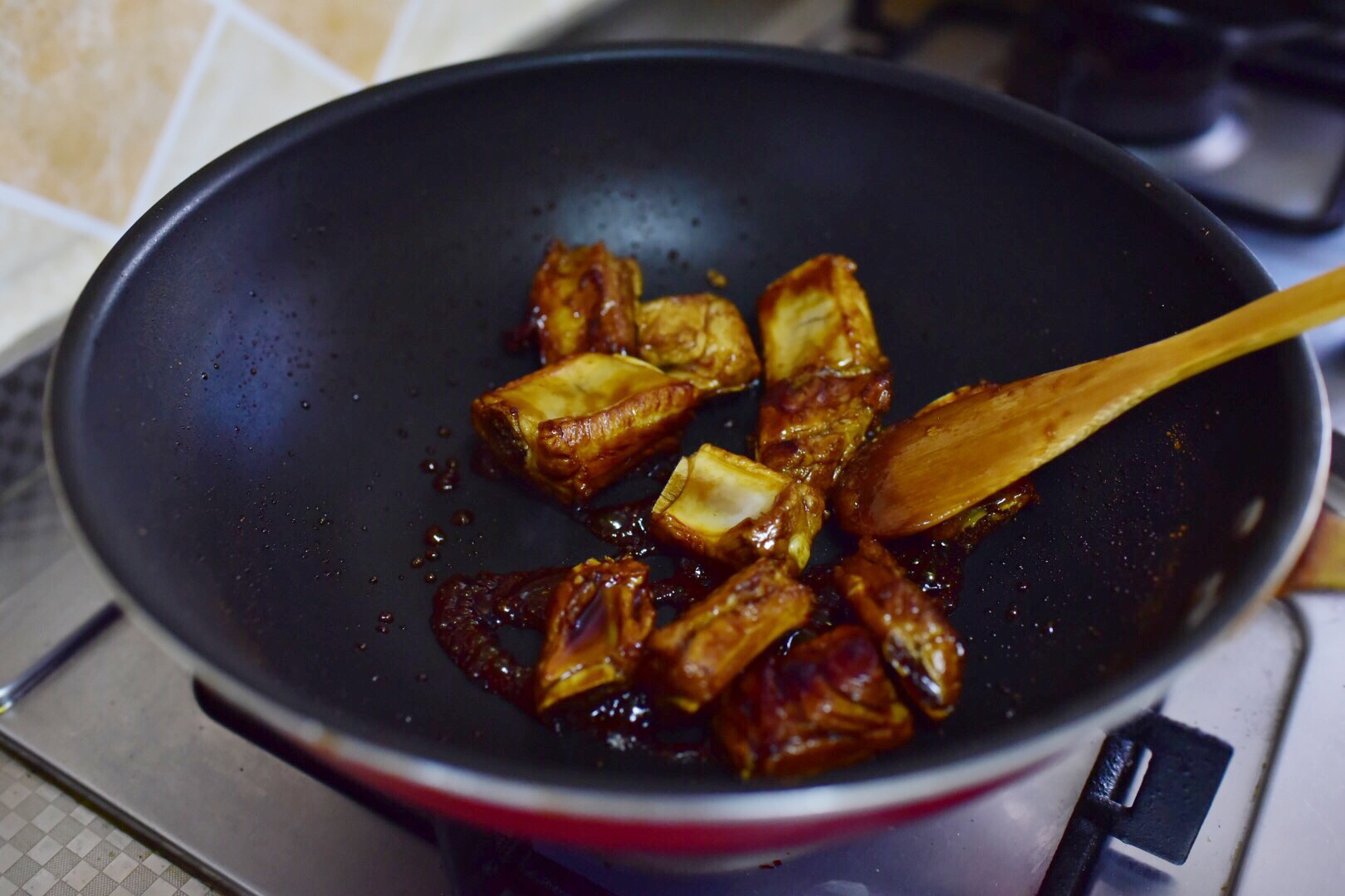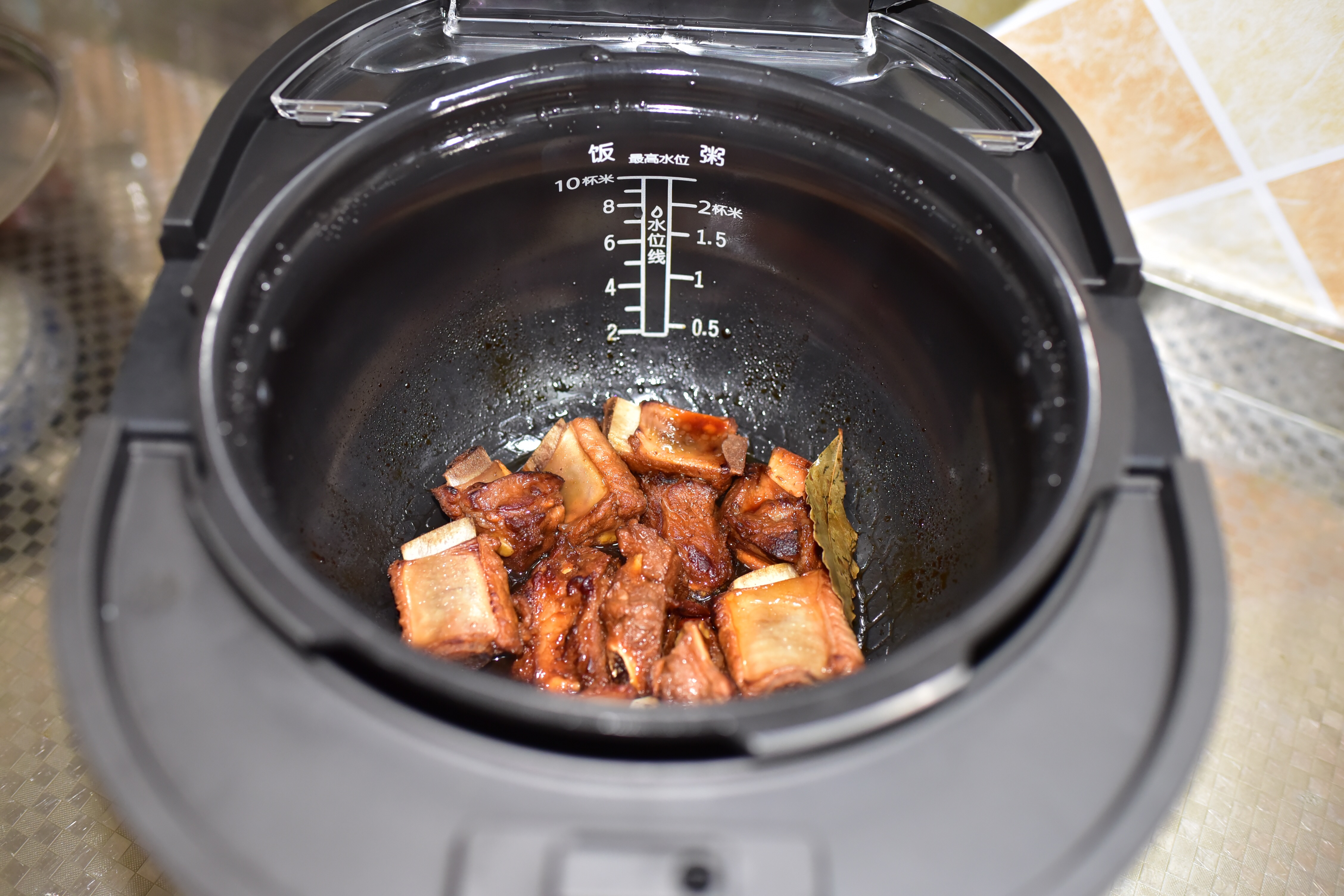 6烹飪結(jié)束開蓋,按開蓋收汁鍵加入醋后翻炒,讓小排收汁上色,收汁至合適程度后取消操作。