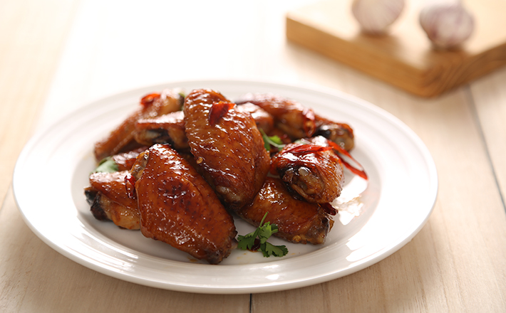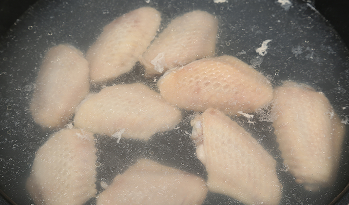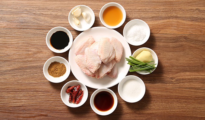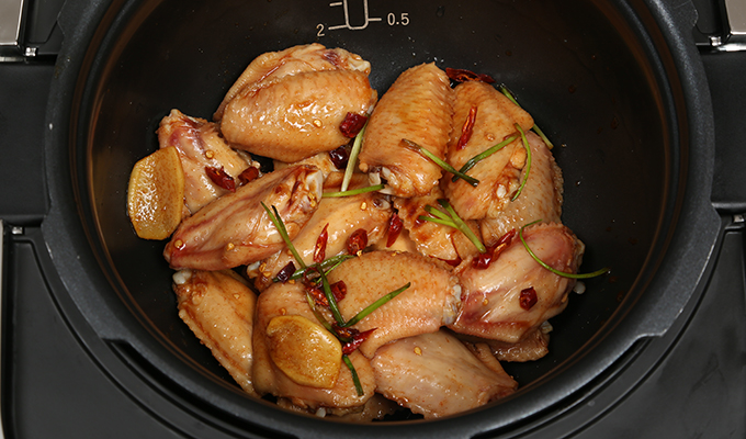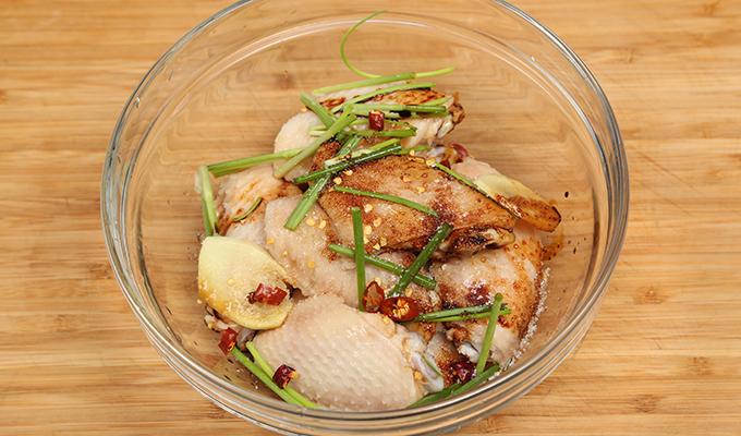 將生姜和蒜切碎,干辣椒切圈,與其他輔料一起,將雞翅腌制
