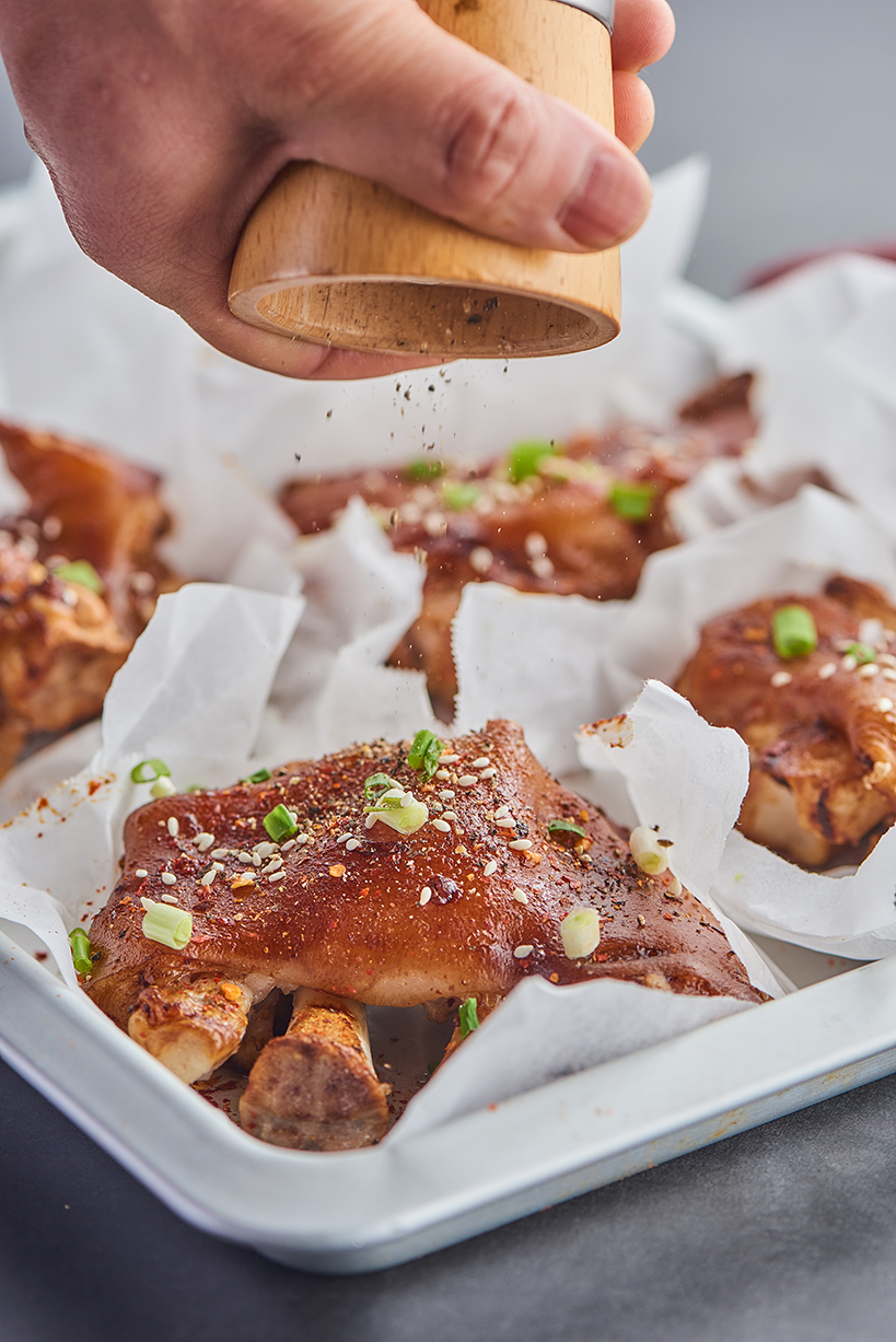 取出豬蹄,洗凈鍋,裝入烤籃,放入燉好的豬蹄(皮朝上),刷一層食用油,撒上適量白芝麻、孜然粉和椒鹽,蓋上烘烤蓋;
