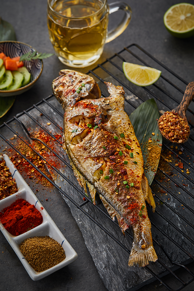 在烤籃注水區中加水,平鋪放入黃花魚,抹油,蓋烘烤蓋。