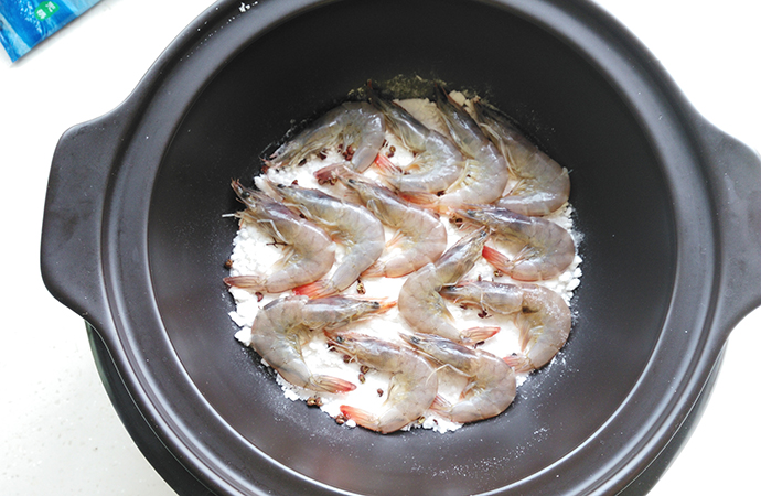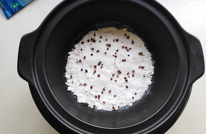 6、沙鍋里放入鹽,鹽的厚度大概1厘米