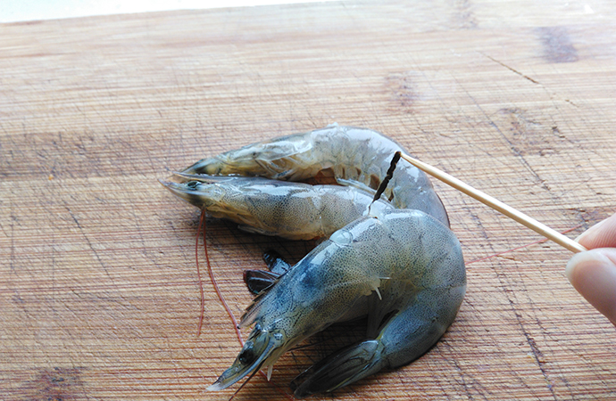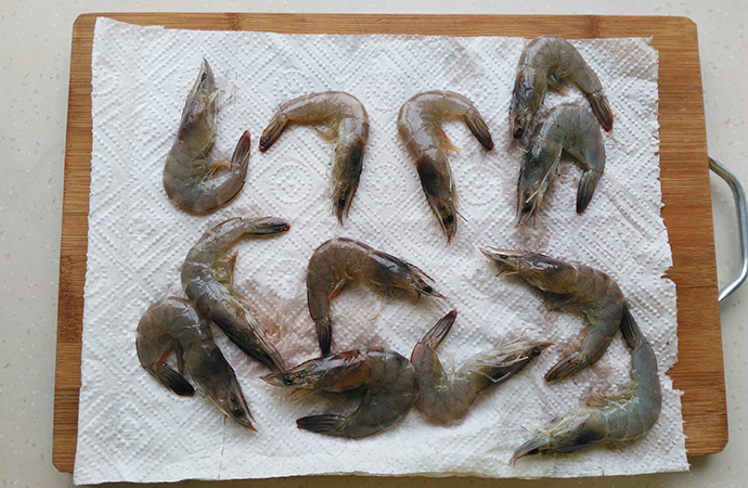 9、待花椒發出香味后將蝦平鋪在鍋里