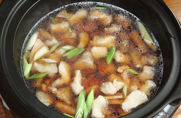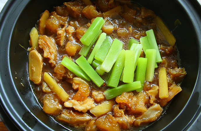 3、上色均勻時,加水沒過蹄筋約一指高度后燉煮