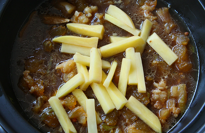 4、烹飪時間剩余20分鐘時倒入萵筍、土豆繼續燜煮