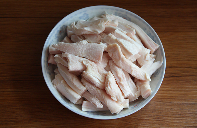 1、汆水后的蹄筋撈出用流動的水沖洗干凈,瀝干
