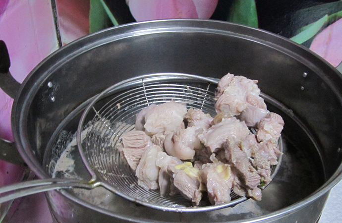 1、汆水后的羊肉撈出用流動的水沖洗干凈,瀝干